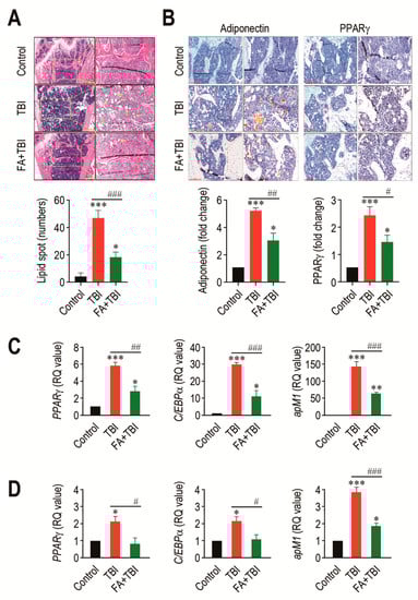 An adipogenic activation in BM is one of the important alterations after ionizing irradiation, and this contributes to deterioration in bone formation []. We assessed whether TBI actually stimulates adipogenic differentiation in BM, and whether this is also suppressed by supplementation with ferulic acid. To address this, we initially checked the presence of lipid spot formation in BM of mice and counted its numbers 60 days after TBI (Figure 5A). As shown in the images of H&E staining, the numbers of lipid spots in BM of the TBI group were significantly higher compared with that of the control (p < 0.001) or FA+TBI group (p < 0.001) at 60 days post-TBI. TBI-mediated increase in lipid accumulation was correlated with the expression levels of adipogenic markers, adiponectin and PPARγ, in which supplemental ferulic acid significantly (p < 0.05) diminished expression of these markers in the BM (Figure 5B). To further evaluate the impacts of TBI or in combination with ferulic acid on adipogenesis in BM, we determined levels of PPARγ, C/EBPα, and apM1 in BM cells of mice by qRT-PCR assay 30 and 60 days after TBI. The TBI group exhibited significantly higher levels (p < 0.001) of the adipogenic marker genes in BM cells compared with the control group 30 days after TBI (Figure 5C). TBI-mediated increases in PPARγ, C/EBPα, and apM1 in BM cells were also found 60 days after TBI (Figure 5D). Treatment with ferulic acid diminished TBI-mediated upregulation of the adipogenic regulatory genes at both 30 and 60 days post-TBI, in which levels of PPARγ and C/EBPα in the FA+TBI group were comparable with those in control mice 60 days after TBI. These results indicate that, in addition to osteoclastic activation, TBI augments adipogenic activation in BM and BM-conserved cells, and this augmentation is attenuated by supplemental ferulic acid.