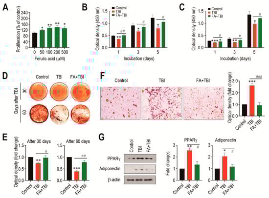 Supplemental ferulic acid restores proliferation and osteogenic differentiation of BMSCs and prevents adipogenic activation of the cells from TBI mice. (A) BMSCs isolated from non-TBI control mice were incubated in growth medium supplemented with ferulic acid (0–500 μm) for 48 h, and proliferation rate was determined by CCK-8 assay. BMSCs were isolated from mice exposed to TBI or in combination with ferulic acid at (B) 30 and (C) 60 days post-TBI, and the cells were incubated in growth medium for the indicated days, followed by CCK-8 assay. (D) BMSCs were isolated from mice groups at 30 and 60 days post-TBI and incubated in osteogenic medium. After 21 days of incubation, cellular mineralization of the cells was evaluated by ARS staining. (E) Mineralization of BMSCs from mice groups was also determined by measuring optical density specific to the ARS at 405 nm. (F) BMSCs were isolated from mice groups 30 days after TBI and incubated in adipogenic medium. The photographs showing ORO-positive adipocytes and optical density specific to the dye were obtained 21 days after incubation. (G) BM cells were isolated from mice groups 7 days after TBI and, after 48 h of incubation in adipogenic medium, protein levels of PPARγ and adiponectin in the cells were determined by immunoblot assay. The relative intensities specific to PPARγ and adiponectin were determined after normalizing the band to the relative intensity of β-actin. All data are presented as the mean ± SD (n ≥ 3). * p < 0.05, ** p < 0.01, and *** p < 0.001 compared with control group; # p < 0.05, ## p < 0.01, and ### p < 0.001 compared with TBI group.