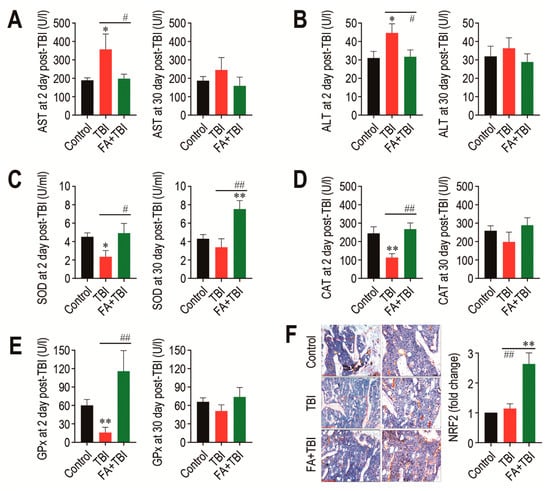 As TBI is known to acutely increase activities of AST and ALT, which are indicative of liver damage [], we determined activities of the enzymes in blood serum 2 and 30 days after TBI. The TBI group showed significantly higher activity (p < 0.05) of AST at 2 days, but not at 30 days post-TBI compared with the control or FA+TBI group (Figure 7A). Similarly, ALT activity in the TBI group was significantly higher (p < 0.05) than that in the control or FA+TBI group at 2 days post-TBI (Figure 7B). Different to the liver-damage-indicative enzymes, the activities of liver-conserved antioxidant enzymes, such as SOD (Figure 7C), CAT (Figure 7D), and GPx (Figure 7E), in the TBI group were acutely diminished 2 days, but not 30 days, after TBI. Treatment with ferulic acid completely blocked TBI-mediated decreases in activities of the enzymes at 2 days post-TBI. In particular, the FA+TBI group revealed significantly higher SOD activity (p < 0.01) than the control or TBI group at 30 days post-TBI (Figure 7C). Furthermore, IHC assay revealed that the FA+TBI group expressed an approximately 2.5-fold higher level (p < 0.01) of NRF2 in BM at 60 days post-TBI compared with that in the control or TBI group (Figure 7F). These results suggest that long-term supplementation with ferulic acid enhances antioxidant defense systems, specifically SOD activity and NRF2 induction, and this enhancement is closely associated with ferulic-acid-induced protection on TBI-mediated oxidative damages.