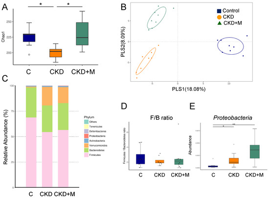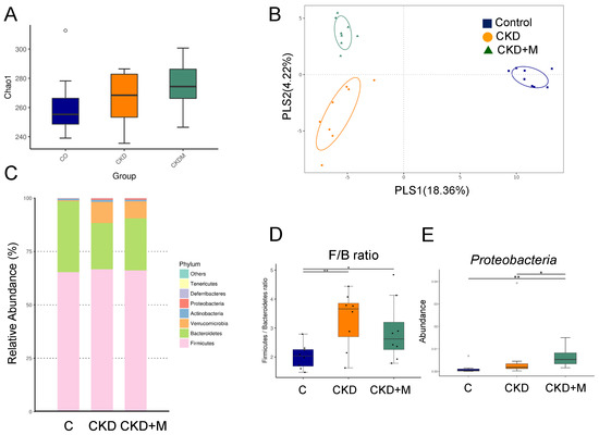Unlike males, the α-diversity was not different among the three groups of females (Figure 3A). Figure 3B shows scatterplots of the PLS-DA analysis that are clearly separated, indicating the three groups displayed distinct enterotypes. Figure 3C shows the F/B ratio was higher in the female CKD and CKD + M groups than that in the C group (Figure 3D). The female CKD + M group showed a greater abundance of the phylum Proteobacteria than the other two groups (Figure 3E).