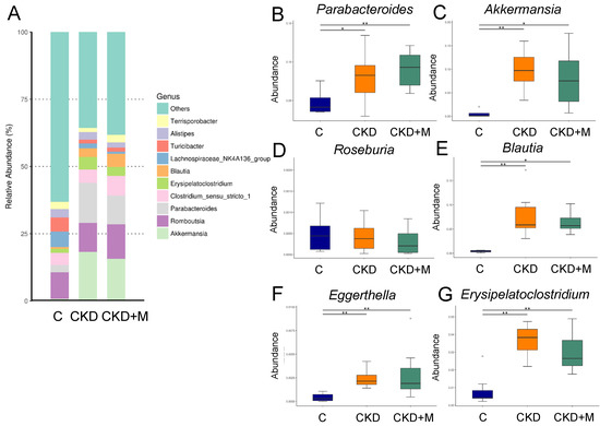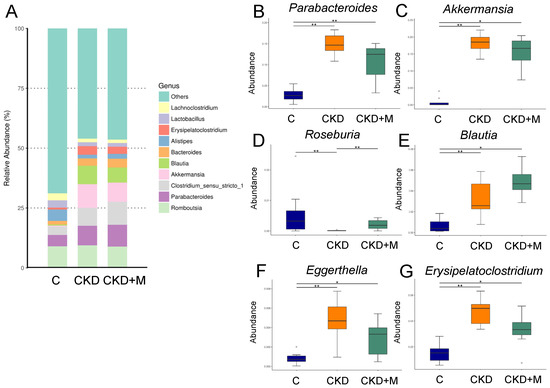 In females, the abundance of the genera Parabacteroides, Akkermansia, Blautia, Eggerthella, and Erysipelatoclostridium were higher in the CKD and CKD + M groups than the C group (Figure 4B,C,E–G). However, the abundance of the genus Roseburia did not differ among the three groups (Figure 4D).