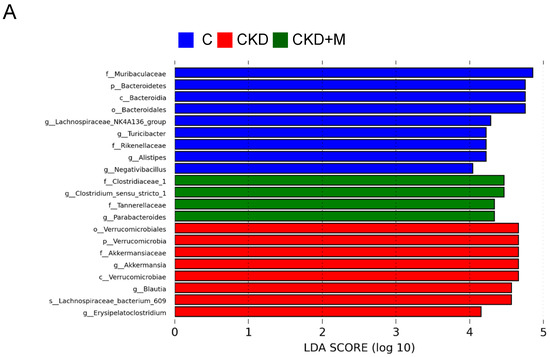 Linear discriminant analysis effect size (LEfSe) was applied to microbial marker discovery in metagenomic data. Here, are the most enriched and depleted bacterial taxa in (A) males and (B) females. C (blue) versus CKD (red) and CKD + M (green) are shown. Different taxonomic levels of bacteria are given, reaching from phylum down to the genus level. The threshold of the linear discriminant was set to four.