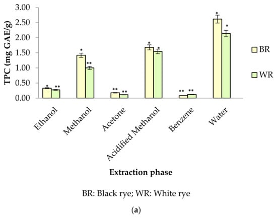 Phenolic profiles of substrates like fruits/vegetables and cereal grains are gaining more attention among researchers, industries and consumers because of their significance to human health. In the present study, six different extraction mediums (ethanol, acetone, methanol, acidified methanol, water and benzene) were used to extract out phenolic compounds from rye cultivars (BR and WR). Among the selected rye cultivars, black rye (BR) possessed a higher amount of phenolic compounds in the different extraction mediums than the white rye (WR). Extraction mediums used during the experimental work of the present study played an important role when extracting phenolics. Water proved to be the better solvent for extracting total phenolics (TPC) from rye flour as compared to acidified methanol, methanol, ethanol, acetone and benzene. The highest TPC was observed in water extracts (BR (2.62 mg GAE/g); WR (2.14 mg GAE/g)), followed by acidified methanol extracts (BR (1.68 mg GAE/g); WR (1.55 mg GAE/g)), methanol (BR (1.42 mg GAE/g); WR (1.00 mg GAE/g)) and ethanol (BR (0.33 mg GAE/g); WR (0.27 mg GAE/g)). As compared to water, neither acidified methanol, methanol, ethanol, acetone nor benzene were efficient enough to extract out a significant amount of phenolics from rye flour (Figure 2a). TPC in water rye extracts (WRE) of BR (2.62 mg GAE/g) and WR (2.14 mg GAE/g) was in consistent with the results of Mishra et al. [39], who reported a maximum TPC of 2.19 mg/g in water extracts of rye. The TPC (1–1.42 mg GAE/g) in the MREs (BR, WR) agreed with the finding of Zielinski et al. [40], who reported 1.35–1.47 mg/g TPC in 80% methanolic extracts. Total phenolic content in methanolic (80%) extracts of rye varied from 0.98–3.36 mg GAE/g in reports by Kulichova et al. [12] and Ragaee et al. [41]. Michalska et al. [17] reported the effect of phosphate buffered saline (PBS) and methanol (80%) on recovery of phenolics from rye grains. The amount of phenolics was 2.31 mg/g for rye extracts prepared in PBS and 1.43 mg/g for methanolic extract. The CTC in BR and WR extracts was observed to be 4.24–9.28 mg CE/100 g (Figure 2b). The highest CTC was noted in acetone extracts of BR (9.28 mg CE/100 g) and WR (8.74 mg CE/100 g), whereas the lowest amount was noted in benzene extracts of BR (4.80 mg CE/100 g) and WR (4.24 mg CE/100 g).