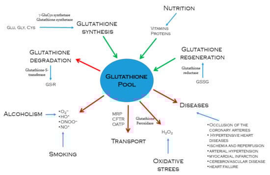 Multiple processes control the plasma GSH/GSSG redox state, including GSH synthesis from its constitutive amino acids, cyclic oxidation and reduction involving GSH peroxidase and GSSG reductase, GSH transport into the plasma, and GSH and GSSG breakdown by γ-glutamyltranspeptidase [49,78,79]. GSH is present in all mammalian cells in a constant state of metabolic recirculation (synthesis, degradation, and irreversible loss of GSH), its half-life is 4 days in human erythrocytes, 2 to 4 h in the cytosol of rat hepatic cells and 30 h in the mitochondrial lumen [40,80]. Many different conditions affect the contents of intracellular GSH, some of them are the presence of heavy metals, high glucose concentrations, protein malnutrition, thermal shock, exposure to reactive oxygen and nitrogen species including, H2O2 and nitric oxide, ozone exposure, ionizing radiation, and cigarette smoke [37,40,61,73,81].