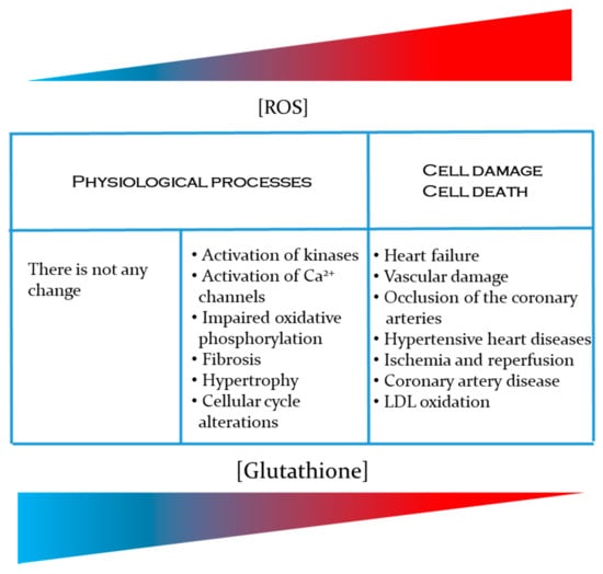 An imbalance in the redox homeostasis could cause cardiovascular complications. ROS are produced by all vascular layers, and they act as signaling molecules that regulate several functions such as vascular smooth muscle cell contraction, relaxation, and growth [129]. In contrast, excessive or sustained increase in ROS generation plays an essential role in endothelial dysfunction (ED) and CVD development. Some cardiovascular risk factors are associated with either increased production of ROS or decreased plasma GSH levels [130]. In both cases, cell damages are due to direct oxidizing effects on proteins, lipids, and DNA [10].