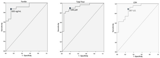 Chicago/Turabian StyleMartinez Mesa, Alvaro, Eva Cabrera César, Elisa Martín-Montañez, Esther Sanchez Alvarez, Pilar Martinez Lopez, Yanina Romero-Zerbo, Maria Garcia-Fernandez, and Jose Luis Velasco Garrido. 2021. "Acute Lung Injury Biomarkers in the Prediction of COVID-19 Severity: Total Thiol, Ferritin and Lactate Dehydrogenase" Antioxidants 10, no. 8: 1221. https://doi.org/10.3390/antiox10081221