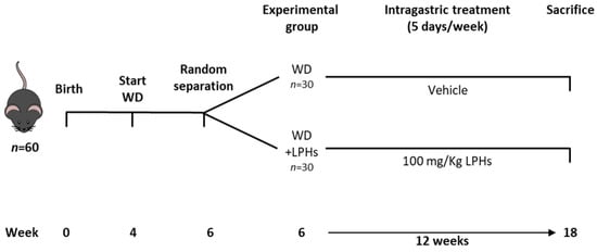Experimental design and timeline. Schematic diagram of the experimental design of the study. WD, Western diet; LPHs, lupin protein hydrolysates.