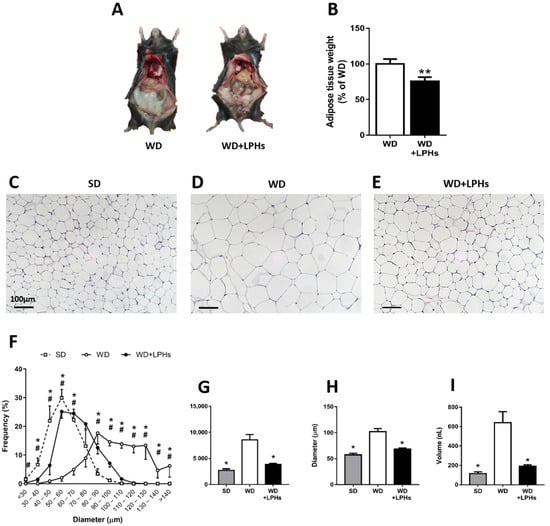 White adipose tissue analysis. Representative image of the abdominal WAT (A). White adipose tissue quantification (B) (n = 30). Representative images of hematoxylin/eosin staining of WAT from SD (C), WD (D), and WD+LPHs (E) groups. Frequency of mean adipocyte size (F), mean adipocyte area (G), diameter (H), and volume (I). Values are shown as the mean and the standard error of the mean of each group. * p ≤ 0.05 respect to the WD group. ** p ≤ 0.01 respect to the WD group. In (F), # p ≤ 0.05 between SD and WD, * p ≤ 0.05 between WD and WD+LPHs. SD, standard diet group; WD, western diet group; WD+LPHs, western diet + lupin protein hydrolysates group.