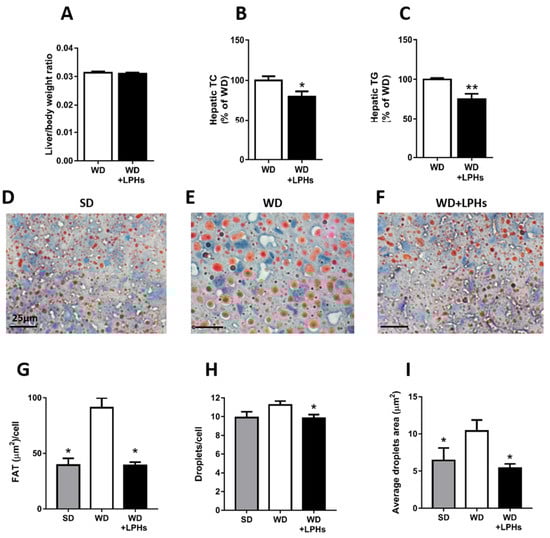 hTC and hTG concentrations were significantly reduced in WD+LPHs-treated mice in comparison with the WD group without affecting liver/body weight ratio (Figure 3A–C) To confirm the reduction of LPHs-induced steatosis, oil red staining was performed in the liver. LPHs-treated mice showed a significant reduction of hepatic lipid accumulation compared to the WD group (Figure 3D–J). Interestingly, the lipid accumulation observed in the WD+LPHs group was similar to the fat concentration present in the liver of SD-fed mice. Fat area (Figure 3G), fat droplets/cells (Figure 3H), and average fat droplets area (µm2) (Figure 3I) were significantly reduced in LPHs-treated mice in comparison to WD group.
