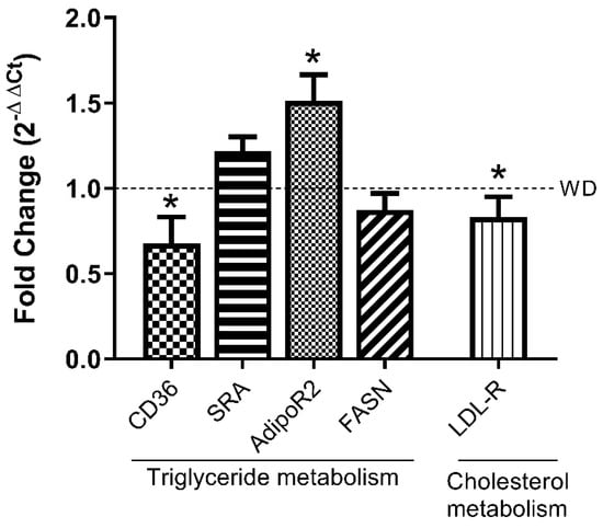 Lipid metabolism markers gene expression. Relative gene expression of scavenger receptors (CD36, SR-A), adiponectin receptor II (adipoR2), fatty acid synthase (FASN), and low density lipoprotein receptor (LDL-R) in the liver of mice after 12 week-treatment with LPHs. Data are shown as the mean of 2−ΔΔCt and standard error of the mean of each group (n=10). * p ≤ 0.05, with respect to the WD group. CD36, cluster of differentiation 36; SR-A, class A macrophage scavenger receptor; WD, western diet group.