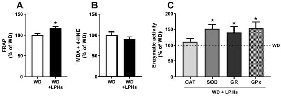A significant increase of the hepatic FRAP was detected in the WD+LPHs group in respect to the WD group (Figure 5A). Furthermore, a trend towards a decrease in the lipid peroxidation products (MDA+4-HNE) was observed in LPHs-treated mice (Figure 5B). In fact, a significant negative correlation between hepatic FRAP and lipid peroxidation was detected in the LPHs-treatment group. (Table 1). A significant enhancement in the SOD, GPx and GR activities as well as a trend towards an increase in CAT activity were recorded in the LPHs-treated mice liver (Figure 5C) Accordingly, GPx and GR activities showed a strong positive correlation with FRAP (Table 1).