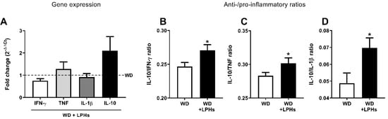 Liver inflammation. Relative gene expression of IFN-γ, TNF, IL-1β, and IL-10 in the liver of mice after 12 weeks of treatment with LPHs (A). The pointed line represents WD group, while the bars represent the LPHs effects with respect to WD group. Ratios between IL-10 and pro-inflammatory cytokines IFN-γ (B), TNF (C), IL-1β (D) expression (n = 10). Results are represented as the mean and standard error of the mean of each group. * p ≤ 0.05 with respect to the WD group. IFN-γ, interferon-γ; IL, interleukin; TNF, tumor necrosis factor; WD, western diet group; WD+LPHs, western diet + lupin protein hydrolysates group.