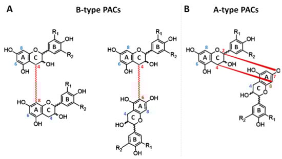 Linkage (red) that allows the polymerization of two monomers of flavan-3-ols, leading to the formation of B-type (A) or A-type (B) PACs.