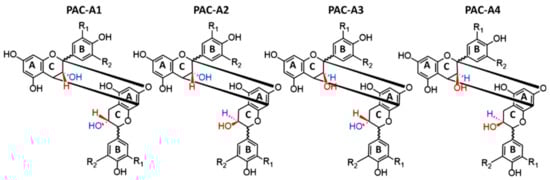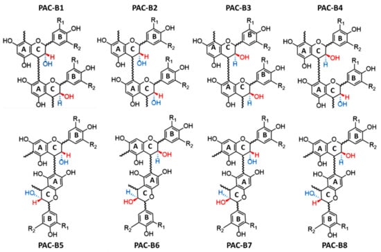 In this case, proanthocyanidins take the name of B-type. However, when the linkage between two units occurs, the hydroxyl group linked to the C-ring of each flavan-3-ol can be in either S or in R. Consequently, four different B-type PACs can be formed from C4–C8 linkages (B1–B4), and another four from C4–C6 (B1–B8) (Figure 3). Moreover, C–O bounds between O7 of one flavan-3-ol unit and C2 of another one can be established [20]. In this case, the PAC is named A-type (Figure 2B). For the same reasons previously described, in this case, four typologies of A-type PACs can be formed (Figure 4).