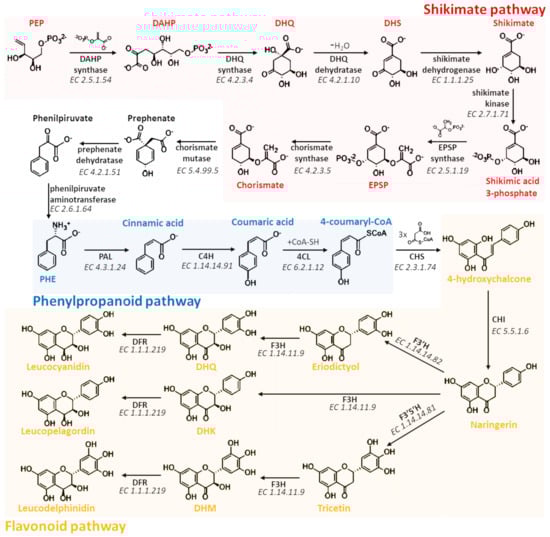 Biosynthetic pathway involved in the synthesis of leucoanthocyanidins, the key precursor compounds of flavan-3-ols. The pathway involves the shikimate (Red), phenylpropanoid (Blue), and flavonoid (Yellow) pathways.