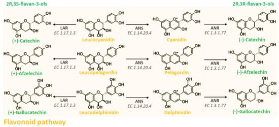 At this point, leucocyanidin, leucopelargonidin, and leucodelphinidin can be converted into their respective anthocyanins by the anthocyanidin synthase (ANS) (EC 1.14.20.4) (Figure 6). This reaction allows the formation of the key compounds that may alternatively enter into biosynthetic pathway of anthocyanins, in which the anthocyanin scaffold may be further modified through different enzymatic modifications, including methylation, acetylation, and glycosylation [15,33]. However, anthocyanins may be converted into the respective colorless 2R,3R-flavan-3-ols by the double reduction operated by the anthocyanidin reductase (ANR) (EC 1.3.1.77). Moreover, since this enzyme is able to saturate the cationic C-ring of the anthocyanin scaffold, it strongly stabilizes the molecules from a chemical point of view. In another pathway branch, leucoanthocyanidins can alternatively be converted into 2R,3S-flavan-3-ols by the leucoanthocyanidin reductase (LAR) (EC 1.17.1.3) without going through the anthocyanidin intermediate (Figure 6). Moreover, this last reaction is very important as it explains the occurrence of PACs and anthocyanins in plants from a phylogenetic point of view. Indeed, plants lacking ANS and ANR are able to produce PACs, but not anthocyanins; plants lacking LAR and ANR are able to produce anthocyanins, but not PACs; meanwhile plants having all the previously reported enzymes are able to produce both PACs and anthocyanins. Moreover, in this latter case, PACs may be composed by both 2R,3S and 2R,3R flavan-3-ols [33].