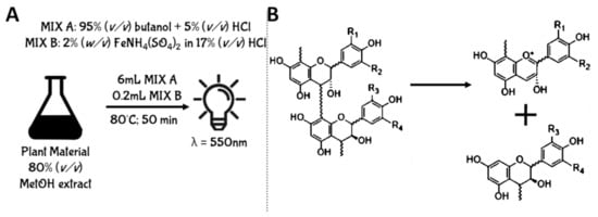One of the main characteristics of PACs is related to their peculiar ability to depolymerize in both acid and strong oxidizing environments leading to the formation of the respective anthocyanin compounds [86]. Consequently, the uncolored mixture containing PACs assumes a very intense red coloration. This unusual property of PACs was then exploited for the development of analytical methods aimed at their quantification. In this context, the Acidic Butanol Assay (also known as Porter’s method or Bate-Smith Assay) is a spectrophotometric assay experimentally designed to quantify PACs using the absorbance produced by anthocyanins derived from their depolymerization process [86]. This methodology consists of the preparation of a reaction mixture, composed of 95% (v/v) butanol acidified with 5% (v/v) HCl (Reagent A), and of a catalytic mixture containing 2% (w/v) FeNH4(SO4)2 dissolved in water acidified with 17% (v/v) HCl (Reagent B). Concerning the experimental protocol, the plant raw material is normally extracted in 80% (v/v) methanol using a ratio ranging from 1:5 (w/v) to 1:20 (w/v). Then, to 1 mL of plant extract are added 6 mL of Reagent A and 200 μL of Reagent B. Therefore, the mixture is centrifuged (8000× g, at room temperature) and incubated at 80 °C for 50 min. During the incubation time, the interflavan bonds are cleaved, forming highly unstable intermediates named carbocations. Since these compounds are very unstable, they spontaneously and quickly arrange in the respective anthocyanins [86]. Once the anthocyanins are formed, the mixture is cooled for 25 min at room temperature, and the absorbance is read at 550 nm (Figure 8).