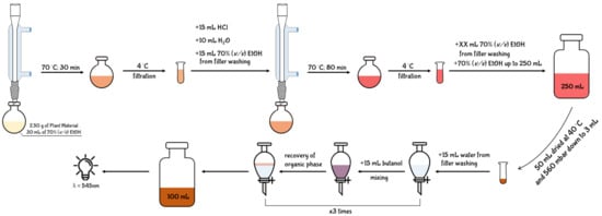 The experimental protocol described in the Pharmacopoeia reports that 2.50 g of plant raw material is weighed and extracted with 30 mL of 70% (v/v) ethanol. Consequently, the mixture is heated to 70 °C under reflux using a round-bottom flask combined with a condenser tube. After 30 min, the extract is cooled on ice and filtered on filter paper. In order to recover any residues from the filter, 10 mL of 70% (v/v) ethanol are employed for washing. The washing solvent is then added to the extract, and the mixture is acidified with 15 mL of HCl and diluted with 10 mL of water. The new acidic mixture is again heated to 70 °C for 80 min under reflux using a clean round-bottom flask combined with the same condenser tube. After the incubation time, the mixture is again cooled on ice, and filtered with a clean paper filter. Moreover, in this case, the filter is washed with 70% (v/v) ethanol until it is completely whitened. The filtrate and the washing solvent are again combined and the mixture is diluted with 70% (v/v) ethanol up to a final volume of 250 mL. Only a 50 mL aliquot of the diluted mixture is concentrated down to 3 mL under reduced pressure using an evaporating rotator (40 °C, 350 mbar). Therefore, the concentrated mixture is transferred into a separatory funnel, and the round-bottom flask is sequentially washed with 10 mL and 5 mL of water. The resulting 15 mL of washing solvent is then combined in the separatory funnel with the mixture previously concentrated. Finally, in order to perform a liquid/liquid separation, 15 mL of butanol are loaded into the separatory funnel and then vigorously shaken for few seconds. After a rapid decantation, the butanol phase enriched in anthocyanins derived from PAC hydrolysis separates from the aqueous one. The butanol phase is then collected and transferred in a clean glass-cylinder. The separation process with butanol is repeated twice, and the individual organic phases are then combined in the same glass-cylinder. The obtained 45 mL are then diluted up to 100 mL with pure butanol, and the absorbance of 1mL of the mixture is read at 545 nm. The content of PACs is finally expressed as percentage using Equation (1):