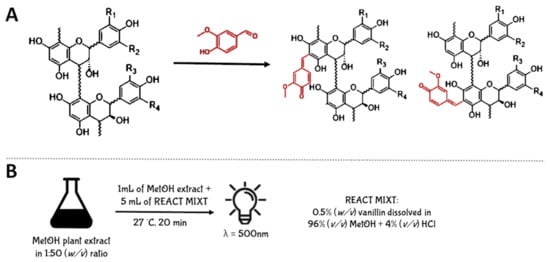 Schematic representation of Vanillin Assay for the quantification of PACs. Panel (A) displays the chemical reaction that allows the formation of red colored adducts, spectrophotometrically measured at 500 nm. Panel (B) displays the experimental protocol.