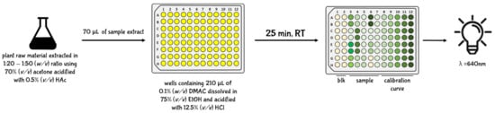 Experimentally, the plant raw material should be extracted with 75% (v/v) acetone acidified with 0.5% (v/v) acetic acid and using 1:20–1:100 (w/v) ratio. The mixture is then vortexed for 30 s, sonicated at room temperature for 30 min, and placed on an orbital shaker for 60 min. After centrifugation (2000× g at room temperature for 10 min), 70 μL of a proper dilution of the extract is added to 210 μL of DMAC solution containing 0.1% (w/v) DMAC dissolved in 75% ethanol (v/v) acidified with 12.5% (v/v) hydrochloric acid. After 25 min of incubation, the absorbance is read at 640 nm and against a blank containing 70 μL of extraction solvent and 210 μL DMAC solution. PAC content is expressed and mg A-type PAC equivalents per 100 g of fresh weight using a calibration curve of pure PAC standard ranged between 20 and 100 ppm (Figure 11).
