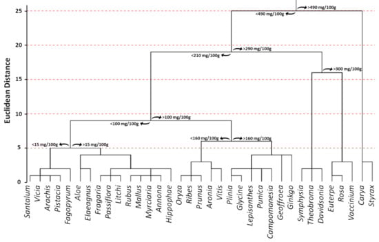 Cluster distribution of proanthocyanidins based on the total proanthocyanidin content within plant families and according to previously published data [96,97,99,100,101,102,104,105,116,117,118,119,120,121,122,123,124,125,126,127,128,129,130,131,132,133,134,135,136,137,138,139,140,141,142,143,144,145,146,147,148]. Euclidean distances were calculated with the average linkage method. Statistical analysis and graphical representation were made using SPSS v. 24 software.