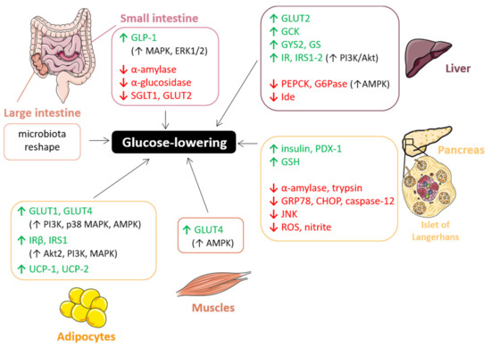 Many studies on PAC’s benefits on human health have been published and, recently, well summarized, in particular regarding their anti-cancer, cardiovascular, and neurological protective properties [30,43]. Moreover, emerging evidence from clinical studies indicates that higher PAC intake is associated with reduced risk of several metabolic disorders, including metabolic syndrome (MetS), non-alcoholic fatty liver disease (NAFLD), and non-alcoholic steatohepatitis (NASH), type 2 diabetes mellitus (T2DM), and the complications associated with it, such as nephropathy and neuropathy [173,174,175]. In particular, PACs are emerging to play a key role in modulating glucose- and lipid-lowering effects. In this review, we will mainly focus on the role of PACs in metabolic disorders, delving into the mechanisms through which this class of compounds may affect both glucose and lipid metabolism also thanks to their capability to interact with food-derived proteins, digestive enzymes, and cell membrane proteins along the entire gastrointestinal tract [176].