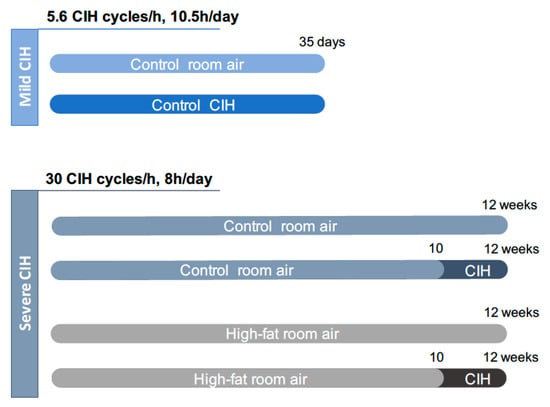 Two paradigms of CIH were used: A mild CIH paradigm of 5.6 CIH cycles/h and a severe CIH paradigm of 30 CIH cycles/h (Figure 1). For the mild CIH paradigm, animals were housed in polypropylene cages, one per cage, as previously described by Sacramento et al. [12]. The cages were kept in a eucapnic atmosphere, inside of medium A-chambers (76 × 51 × 51 cm, A-60274-P, Biospherix Ltd., New York, NY, USA) and animals had ad libitum access to food and water. To guarantee the accuracy of CIH cycles, the chambers have gas injectors and sensors for oxygen (O2) and carbon dioxide (CO2) levels. The CO2 accumulation was avoided by the continuous flow of the gas mixtures, circulation of the gases inside the chambers through vent holes, and using self-indicating soda lime inside the chamber (AnalaR Normapur® VWR International BVBA, Leuven, Belgium) to absorb the expired CO2. Inside the chamber, the CO2 levels never exceeded 1%. To control the oxygen levels inside the chamber, 100% nitrogen (N2) and 100% O2 were used via electronically regulated solenoid switches in a three-channel gas mixer. To achieve the mild CIH protocol, the oxygen levels in the chamber lowered gradually from 21 to 5% O2 (OxyCycler AT series, Biospherix Ltd., New York, NY, USA). To reduce the O2 levels to 5%, the chambers were infused with 100% N2 for 3.5 min and then were infused with 100% O2 for 7 min to restore O2 to ambient concentration of 21%, until the beginning of the next CIH cycle. Each cycle of mild CIH lasted 10.5 min (normoxic period: 3.5 min; hypoxic period: 7 min) and the animals were exposed during their sleep period (light phase of light/dark cycle) to 5.6 CIH cycles/h, 10.5 h/day (9:30 am to 8:00 pm), for 35 days. Throughout the remaining hours, the chambers were ventilated with a constant flow of room air to keep oxygen levels at 21%.