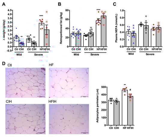 Effect of chronic intermittent hypoxia (CIH/IH) on weight gain, retroperitoneal fat, plasma non-esterified fatty acids (NEFA), and adipocytes perimeter. (A,B) Effect of mild and severe CIH on weight gain and retroperitoneal fat in control and high-fat (HF) animals, respectively. (C) Effect of mild and severe CIH exposure on NEFA in control and HF animals. (D) Effect of severe CIH on adipocytes perimeter in control and HF animals. Panels represent haematoxylin and eosin staining of adipose tissue in control, severe CIH, obese, and obese plus severe CIH animals. Animals were submitted to the mild CIH (5.6 CIH cycles/h, 10.5 h/day) during 35 days, while in the severe CIH (30 CIH cycles/h, 8 h/day). The control and HF animals were exposed to the protocol in the last 2 weeks of the diets. Data are presented as means ± SEM of 4–8 animals. One- and two-way ANOVA with Dunnett’s and Bonferroni multiple comparison tests, respectively: ** p < 0.01 and **** p < 0.0001 compared with control animals of the respective; # p < 0.05 compared values with HF animals without CIH.