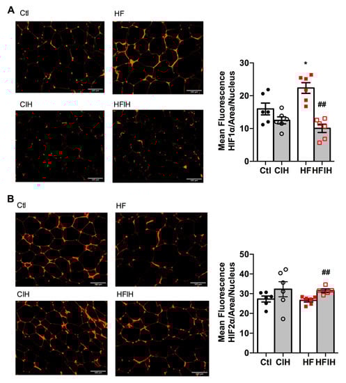 Effect of chronic intermittent hypoxia (CIH/IH) exposure on adipose tissue hypoxia in control and high-fat (HF) animals. (A,B) Immunofluorescence images for the hypoxia-inducible factor 1- and 2-alpha (HIF-1α and HIF-2α) immuno-positive staining, respectively, on adipose tissue (right panels) and the mean fluorescence of HIF-1α and HIF-2α, normalized for the number of nucleus (left panels) present in the adipose tissue of control and HF animals. Data are presented as means ± SEM of 5–6 animals. One- and two-way ANOVA with Dunnett’s and Bonferroni multiple comparison tests, respectively: * p < 0.05 compared with control animals; ## p < 0.05 compared values with HF animals without CIH.