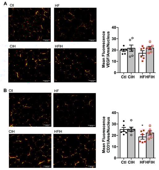 Hypoxia is commonly associated with angiogenic processes aiming at the normalization of O2 levels within the tissues. Therefore, we also evaluated two angiogenesis markers, VEGF and cluster of differentiation 31 (CD31 or platelet endothelial cell adhesion molecule), in adipose tissue of control and HF animals submitted to severe CIH treatment. Figure 4A,B shows representative images for VEGF and CD31-immuno-positive staining (right panels) and the correspondent quantification of the mean fluorescence intensity in adipose tissue, respectively. Severe CIH did not alter angiogenic markers expression in the adipose tissue (Figure 4A,B). In contrast, HF diet prompted a non-significant decrease in VEGF presence (Figure 4A), while significantly decreased the expression of CD31 by 26% in comparison with control animals (Figure 4B). The CIH treatment in HF animals attenuated, in a non-significant manner, the decreased VEGF and CD31 expression in the obese model (Figure 4B).