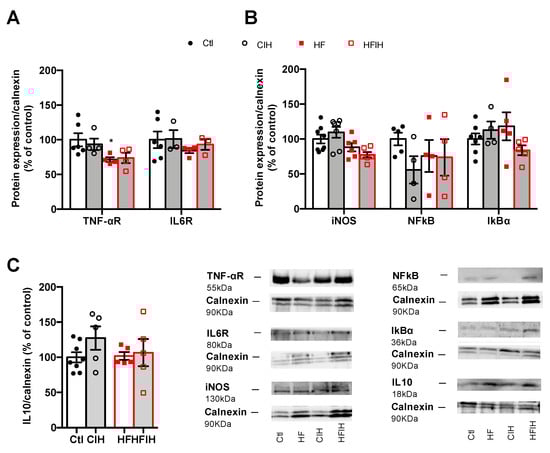 Adipose tissue inflammation has been proposed as the major mechanism behind metabolic dysfunction in OSA [18,24,25,26]. Therefore, we evaluated the effect of CIH on the expression of some inflammatory markers within the adipose tissue. Mild CIH did not alter the expression of IL1R, IL6R, and F4/80 a macrophage marker in visceral adipose tissue (Appendix A Figure A1). Moreover, severe CIH exposure for 2 weeks did not modify the expression of IL6 and TNF-α receptor and the expression of IL10 in control animals (Figure 5A,C). In HF animals, the expression of IL6 receptor and IL10 did not change with the HF diet consumption (Figure 5A,C), while the expression of TNF-α receptor decreased by 29%, an effect that is not modified when the animals were exposed for 2 weeks to severe hypoxia (Figure 5A). Additionally, severe CIH did not change the expression of iNOS, NFkB, and IkBα in the adipose tissue of control and HF animals (Figure 5B).