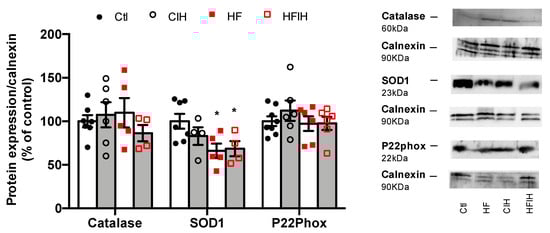 Effect of chronic intermittent hypoxia (CIH/IH) exposure on adipose tissue oxidative stress in control and high-fat (HF) animals. Effect of severe CIH on catalase (60 kDa), superoxide dismutase (SOD1, 23 kDa), and P22Phox (22 kDa) immunoreactivity in control and HF animals in relation to the expression of the loading protein, calnexin (90 kDa). Representative Western blots for each protein studied are depicted in the right panel. Data are presented as means ± SEM of 4–8 animals. One- and two-way ANOVA with Dunnett’s and Bonferroni multiple comparison tests, respectively: * p < 0.05, compared with control animals.