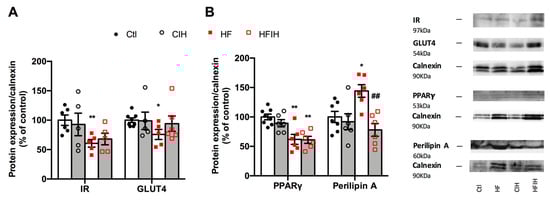 Figure 7 shows the effect of severe CIH exposure on the metabolism of adipose tissue in control and HF animals. Severe CIH, per se, did not modify the expression of the insulin receptor and GLUT4. As expected, the HF diet decreased insulin receptor and GLUT4 expression [33] by 39 and 24%, respectively (Figure 7A). Severe CIH did not modify the expression of the insulin receptor in the HF animals, while increases non-significantly by 24% the expression of GLUT4. The expression of PPARγ, a nuclear receptor and transcription factor that regulates adipocyte differentiation, and perilipin A, a protein involved in lipid storage and fatty acid release, were also evaluated [34]. Severe CIH, per se, did not alter PPARγ and perilipin A expression within the adipose tissue (Figure 7B). In contrast, the HF diet decreased adipose tissue levels of PPARγ by 38% and increased the expression of perilipin A by 44%. CIH in HF animals did not modify PPARγ levels but decreased perilipin A by 85% (Figure 7B).
