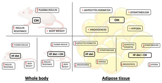 Obstructive sleep apnea (OSA), the most common sleep disorder, is characterized by repetitive episodes of airflow cessation (apnea) or airflow reduction (hypopnea) caused by an obstructed or collapsed upper airway during sleep, which results in intermittent hypoxemia and hypercapnia. It is estimated that 1 billion adults aged 30–69 years worldwide could have OSA [1]. Over the years, several studies have described the relationship between OSA and metabolic diseases. Intermittent hypoxia and sleep fragmentation lead to insulin resistance, type 2 diabetes, metabolic syndrome, and aggravates obesity [2]. This relationship is not unidirectional since obesity is considered a major risk factor for the development and progression of OSA [3,4]. In fact, the prevalence of OSA in people with metabolic syndrome is almost 70% [3,5] and with type 2 diabetes almost 50% [6,7]. However, high glycemia, insulin resistance, and hyperinsulinemia are also metabolic pathological features present in lean OSA patients [8,9], meaning that OSA may increase the risk of dysmetabolism independently of the traditional cardiometabolic risk factors, such as obesity. In agreement, animal data show that rats and mice exposed to different chronic intermittent hypoxia (CIH) paradigms exhibit pathological metabolic characteristics as insulin-resistance and glucose intolerance, in the absence of obesity [10,11,12,13]. In fact, CIH-induced weight loss, at least in mice, [10,13,14] and dependently on CIH severity [14].