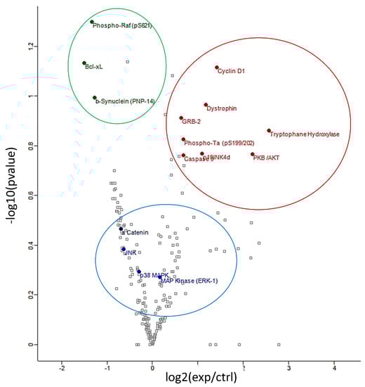 An antibody microarray was employed in these experiments as it represents a powerful tool for examining the abundance of numerous large proteins simultaneously. The expression profile of hippocampal proteins involved in signal transduction, neuroplasticity, apoptosis and cell cycle regulation was found to be significantly modulated (p < 0.05) following 6 weeks’ intake of anthocyanin-rich extract compared to the iso-caloric control. The protein array analyses resulted in more than 200 quantified proteins (Supplementary Table S1). Figure 2 depicts a volcano plot of proteins quantified by the protein array approach. The overexpressed proteins are highlighted in red, on the right of graph. The under-expressed proteins are showed in green, on the left of the graph.