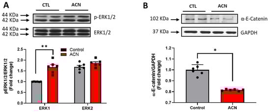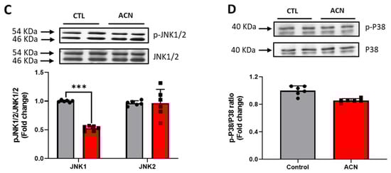 Immunoblotting analysis of proteins extracted from the hippocampus. Crude lysates (20–40 µg protein) were immunoblotted with antibodies that specifically recognise (A) phospho-ERK1/2, total ERK1/2; (B) α-E-catenin and GAPDH; (C) phospho-JNK1/2, total JNK1/2 and (D) phospho-p38, total-p38. Results (phospho/total ratio for ERK1/2, JNK1/2, and p38; protein/GAPDH ratio for α-E-catenin) are presented as means ± SEM (n = 6). Band intensities were determined by densitometric analysis using Fiji Image J. *** p < 0.001; ** p < 0.01; * p < 0.05: indicate significant differences versus control. CTL = control; ACN = anthocyanins.
