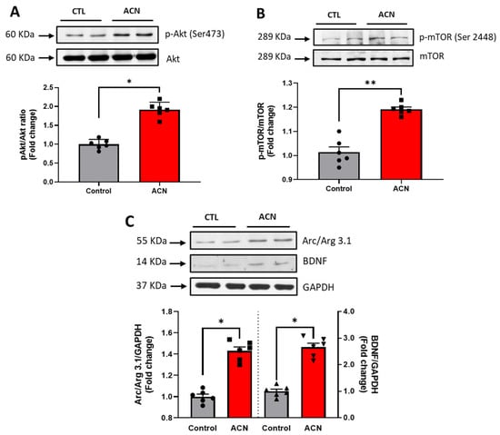 Immunoblotting analysis of proteins extracted from the hippocampus. Crude lysates (20–40 µg protein) were immunoblotted with antibodies that specifically recognise (A) phospho-Akt Ser 473, total Akt; (B) phospho mTOR Ser 2448, total mTOR amd (C) Arc/Arg 3.1, BDNF and GAPDH. Results (phospho/total ratio for Akt Ser473, mTOR Ser 2448; protein/GAPDH ratio for Arc/Arg3.1 and BDNF) are presented as means ± SEM (n = 6). Band intensities were determined by densitometric analysis using Fiji Image J. ** p < 0.01; * p < 0.05: indicate significant differences versus control. CTL = control; ACN = anthocyanins.