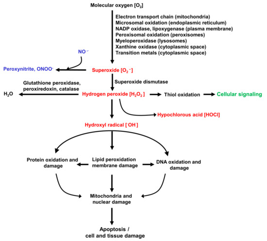 Reactive oxygen species (ROS) involved in liver disease. Shown are the main ROS (in red), the pathways for their formation, and a schematic indication of the downstream damage to proteins, DNA, and organelles that can potentially be caused by ROS. Under normal conditions (non-oxidative stress), H2O2 also has important intracellular signalling functions (indicated in green). Superoxide can also generate reactive nitrogen species (indicated in blue), which contribute to cellular injury.