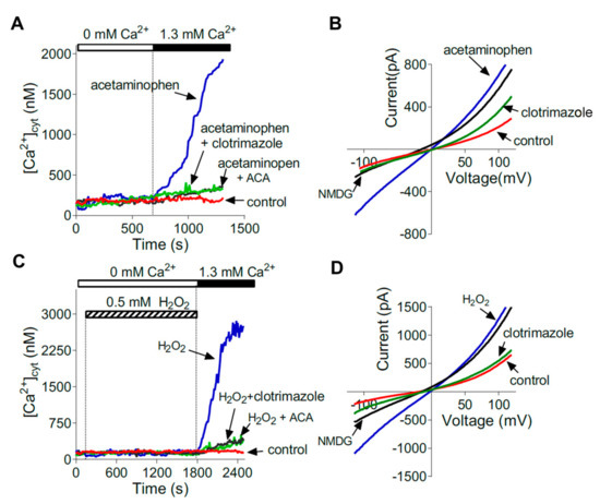 Evidence for the expression of functional TRPM2 channels in the plasma membranes of isolated mouse hepatocytes. TRPM2 channels were activated by acetaminophen (A,B) or H2O2 (C,D). Ca2+ entry was assessed by the increase in cytoplasmic Ca2+ concentration ([Ca2+]cyt) (A,C) or by patch clamp recording of TRPM2 currents (B,D). Properties of the currents activated by acetaminophen and H2O2 are similar to those observed for TRPM2 channels in other cell types. Evidence for TRPM2 channel activity is also provided by use of the TRPM2 inhibitors, clotrimazole, and N-(p-amylcinnamoyl) anthranilic acid (ACA). NMDG is N-methyl-d-glucamine. Reproduced with permission from Kheradpezhouh et al. [29].