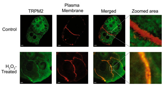 In rat hepatocytes, H2O2 induces the movement of some TRPM2 protein from intracellular locations to the plasma membrane. Confocal microscopy images (100× magnification) of untreated control hepatocytes (Control) and hepatocytes treated with H2O2 (H2O2 treated). Green fluorescence corresponds to TRPM2 and red fluorescence to cadherin (marker protein for the plasma membrane). Yellow indicates the overlap between green and red fluorescence (Merged and Zoomed area), representing TRPM2 and the plasma membrane, respectively. Reproduced with permission from [43], copyright 2018 Elsevier.