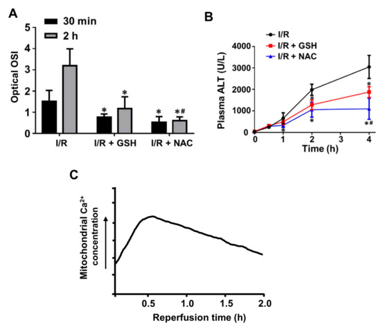 Increases in reactive oxygen species and intracellular Ca2+ in livers subject to ischemia and reperfusion. Comparison of changes in reactive oxygen species (oxidative stress) (A), blood concentrations of alanine transaminase, an indicator of liver damage (B), and mitochondrial calcium (C) following ischemia and reperfusion in mouse and rat models of liver ischemia–reperfusion injury. Oxidative stress is increased at 30 min and increases further at 120 min post initiation of the reperfusion (A). Mitochondrial calcium is increased at 5 min and reaches a peak at about 30 min post initiation of the reperfusion (C). Significant liver injury is apparent at 120 min post initiation of the reperfusion (B). (A) Oxidative stress index (OSI) measured in vivo at 30 min and 120 min following the beginning of the reperfusion in mouse livers subject to ischemia–reperfusion (I/R) without any pre-treatment, and following pre-treatment with the anti-oxidising agents glutathione or N-acetylcystamine (NAC). (B) Time courses for the increase in blood concentrations of alanine amino transferase following commencement of reperfusion for the livers shown in (A). (C) A schematic representation of the time course for the increase in mitochondrial calcium in mouse and rat livers subject to reperfusion following ischemia, based in the results of studies conducted by Isozaki et al. (2000), Pan et al. (2012), and Chattopadhyay et al. (2012) [78,81,82]. Oxidative stress index in (OSI in A) is defined as the ratio of the mean intensity of the sum of cellular H2O2 and HOCl (ROS) to the mean intensity of cellular glutathione (GSH). HOCl, H2O2, and glutathione were measured in vivo by two-photon dual imaging. * p < 0.05, compared with untreated groups; # p < 0.05, compared with I/R + GSH group. Panels (A,B) are reproduced from [77].