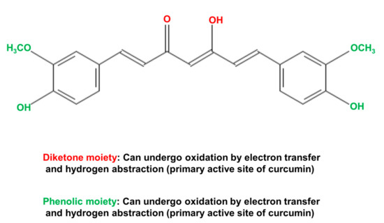 The biological actions of curcumin can be principally attributed to three highly reactive functional chemical groups [120,121]. These are the two phenolic moieties and the central diketone moiety (Figure 8). These functional groups, especially the diketone moiety (including the two α-, β-unsaturated carbonyl groups) are responsible for the ability of curcumin to interact with ROS, proteins, DNA, and many metal ions [120,121]. The chemical (non-enzymatic) interaction of curcumin with various species of ROS endows curcumin with powerful antioxidant properties. The chelation of metals by curcumin in non-enzymatic reactions can both remove metals that cause cell toxicity and provide an avenue for curcumin to act as a metal-based antioxidant. The latter is achieved by complexes of curcumin with Cu2+ or Mn2+ that can interact with superoxide. Non-enzymatic covalent modification of enzymes and other proteins by curcumin, for example covalent modification of cysteine residues, can result in inhibition or activation of the target enzyme [120,121,128,129]. However, the highly reactive functional groups, which provide curcumin with its biological activities, are also responsible for its rapid metabolism by the liver and its low bioavailability when administered to humans and animals [120,121].