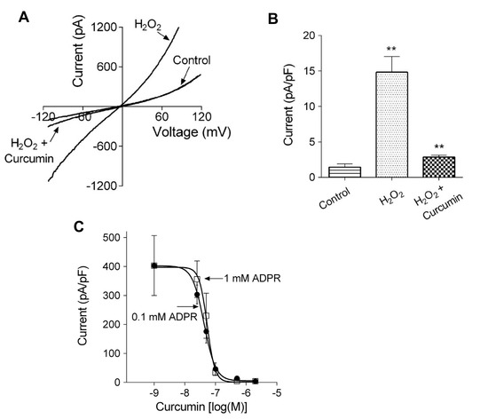 Curcumin inhibits TRPM2 non-selective cation channels, assayed by patch clamp recording, in isolated rat hepatocytes and in HEK293T cells heterologously expressing TRPM2. (A) Current–voltage plots for hepatocytes treated with H2O2 to activate TRPM2, measured in the presence and absence of 5 µM curcumin. (B) Average amplitude of the TRPM2-mediated Na+ current in untreated hepatocytes (Control), hepatocytes treated with H2O2 (H2O2) and in hepatocytes treated with H2O2 in the presence of 5 µM curcumin (H2O2 + Curcumin). ** P < 0.008 (C) Dose–response curves for the inhibition of the TRPM2 current activated by ADP-ribose (two concentrations administered via the patch pipette) to HEK293T cells heterologously expressing TRPM2. The IC50 values for curcumin inhibition are about 50 nM. Reproduced with permission from [119], copyright 2016 Elsevier.