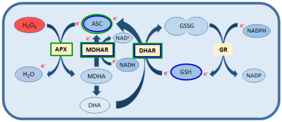 - Noctor, G.; Foyer, C.H. Ascorbate and glutathione: Keeping active oxygen under control. Annu. Rev. Plant Physiol. Plant Mol. Biol. 1998, 49, 249–279. [Google Scholar] [CrossRef]