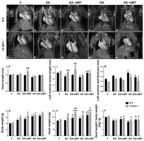 Impact of NLRP3 deficiency and melatonin therapy on cardiac magnetic resonance imaging and anthropometric parameters during aging. (A–E) Magnetic resonance imaging of the heart of young (Y), early-aged (EA), early-aged with melatonin (EA + aMT), old-aged (OA), and old-aged with melatonin (OA + aMT) WT mice. (F–J) Magnetic resonance imaging of the heart of Y, EA, EA + aMT, OA, and OA + aMT NLRP3−/− mice. (K) Analysis of the heart length (cm). (L) Analysis of the luminal length of the left ventricle (cm). (M) Analysis of the thickness of the left ventricular wall (cm). (N) Analysis of the body weight (g). (O) Analysis of the heart weight (mg). (P) Analysis of the ratio of the heart weight to the body weight (mg/g). * p < 0.05, ** p < 0.01 and *** p < 0.001 vs. Y; # p < 0.05, ## p < 0.01 and ### p < 0.001 vs. aged group without melatonin; $ p < 0.05, $$ p < 0.01 and $$$ p < 0.001 vs. WT mice.