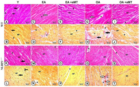 Effect of NLRP3 deletion and melatonin supplementation on age-associated histological changes of cardiac muscle fibers. (A,B) Left ventricle (LV) of the Y WT mice showing the normal cardiac muscle fibers (MF) architecture, with central nucleus (black arrows), and narrow interstitial spaces (black asterisks). (C,D) LV of the EA WT mice revealing an initial necrotic degree (N), with lymphocytic infilterates (white arrow) and wide interstitial spaces (black asterisks). (E,F) The conservative effect of melatonin on maintaining normal muscle fibers (MF) of EA mice, with narrow interstitial spaces (black asterisks). (G,H) LV of the OA WT mice demonstrating severe necrotic changes (N), with lymphocytic infiltrations (white arrow), excessive collagen deposition (black arrows), and wide interstitial spaces (black asterisks). (I,J) The protective effect of melatonin on improving cardiac muscle fibers (MF) and minimizing interstitial tissues (black asterisks) in OA animals. (K,L) LV of the Y NLRP3−/− mice showing the normal cardiac muscle fibers organization (MF), with centrally located nuscle (black arrows) and interstitial spaces (black asterisks). (M,N) LV of the EA NLRP3−/− mice revealing wide interstitial spaces (black asterisks) without necrosis. (O,P) The preservative effect of melatonin on keeping normal structure of cardiac myocytes (MF) in EA mice. (Q,R) LV of the OA NLRP3−/− mice demonstrating less necrotic changes (N), interstitail spaces (black asterisks), and collagen deposition (white arrows). (S,T) The beneficial effect of melatonin on improving cardiac architecture, with narrow interstitial spaces (black asterisk). Bar = 50 μm. (A,C,E,G,I,K,M,O,Q,S) stained with H&E stain, while (B,D,F,H,J,L,N,P,R,T) stained with Van Gieson stain.