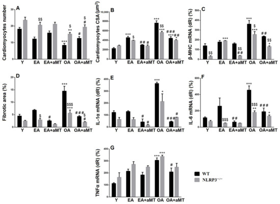 Effect of NLRP3 deletion and melatonin supplementation on age-associated morphometrical changes of cardiac muscle fibers, as well as hypertrophy-associated and inflammatory cytokines genes. (A,B) Age-associated morphometrical changes in cardiac muscle fibers number (per 100 μm2) and cross-sectional area (CSA). (C) mRNA expression level of β-MHC. (D) Morphometrical analysis of cardiac fibrosis during aging. (E) mRNA expression level of IL-1α. (F) mRNA expression level of IL-6. (G) mRNA expression level of TNFα * p < 0.05, ** p < 0.01 and *** p < 0.001 vs. Y; # p < 0.05, ## p < 0.01 and ### p < 0.001 vs. aged group without melatonin; $ p < 0.05, $$ p < 0.01 and $$$ p < 0.001 vs. WT mice.