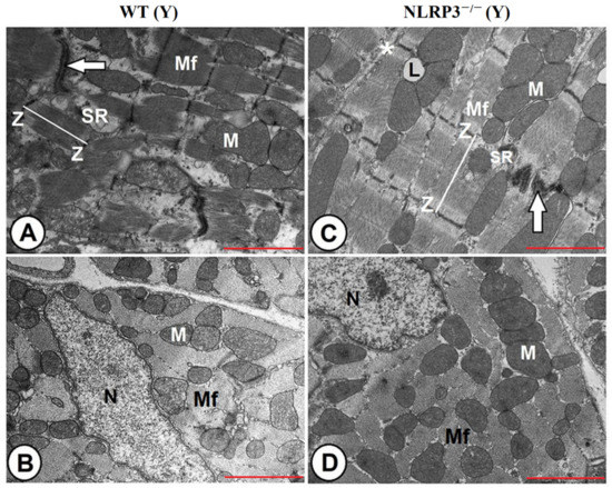 Electron microscopy analysis of the LV of the Y WT mice clarified the normal ultrastructure of the cardiac muscle fibers, which are composed of centrally located nuclei and are formed as well-organized longitudinally arranged myofibrils that illustrated cross and longitudinal striations, with presence of the sarcoplasmic reticulum in between. Each myofibril constitutes of thread-like myofilaments: actin and myosin. The sarcomeres are well aligned between each two successive Z-lines. Cardiomyocytes branched repeatedly and attached strongly at the intercalated disc (Figure 4A). The mitochondria were intact and compacted with clearly organized cristae and were gathered in different orientations: clusters in between cardiac myofibrils as intermyofibrillar, around the nucleus, and beneath the sarcolemma as subsarcolemmal (Figure 4B). Cardiac fibers had better structure in Y NLRP3−/− mice than WT ones. The myofibrils depicted an organized sarcomere and highly compacted mitochondria with densely packed, well-arranged cristae and narrow interstitial spaces with a normally oriented sarcoplasmic reticulum (Figure 4C,D).
