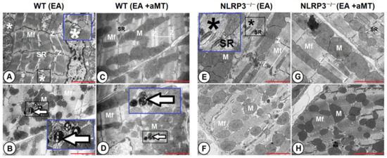 Impact of NLRP3 absence and melatonin treatment on the ultrastructure of early-aged cardiac myocytes. (A,B) Transmission electron micrographs of the LV of the EA WT mice showing disorganized myofibrils (Mf) and sarcoplasmic reticulum (SR). Some mitochondria displayed vacuolation and cristae damage (white asterisk), with appearance of small-sized multivesicular bodies (arrow). Higher magnifications of the black boxed areas in the blue insets. (C,D) Transmission electron micrographs of the LV of the EA WT mice after melatonin supplementation. The cardiac myofibrils (Mf) maintained the normal orientation, with intact mitochondrial contents (M), organized sarcoplasmic reticulum (SR), and reduced residual bodies (arrow). Higher magnification of the black boxed area in the blue inset. (E,F) Transmission electron micrographs of the LV of the EA NLRP−/− mice revealing absence of age-related alterations in the myofibrils architecture (Mf), sarcoplasmic reticulum (SR), and mitochondrial composition (M), except presence of individual disorganized myofibrils with indistinct striations (black asterisk). Higher magnification of the black boxed area in the blue inset. (G,H) Transmission electron micrographs of the LV of the EA NLRP−/− mice with melatonin therapy demonstrating improvement of myofibrils (Mf) and their sarcoplasmic reticulum (SR) and mitochondrial contents (M). Note sarcomeres arrangement between each two successive Z-lines (Z). Bar “red line” = 2 μm.