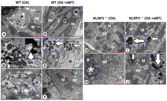 Effect of NLRP3 ablation and melatonin administration on age-associated ultrastructural alterations of cardiac muscle fibers. (A–C) Transmission electron micrographs of the LV of the OA WT mice illustrating widening of interstitial spaces (white asterisk) and disruption of the sarcoplasmic reticulum (SR) between myofibrils (Mf). Some mitochondria revealed a normal structure (M), while others were hypertrophied and demonstrated different stages of cristae damage with presence of inclusions bodies on their matrix (black asterisks). Splitting of the nucleus (N) was mostly clarified, with formation of autophagosomes (arrow). Higher magnifications of the black boxed areas in the blue insets. (D–F) Transmission electron micrographs of the LV of the OA WT mice after melatonin supplementation showing conservation of cardiac myofibrils (Mf), nuclear structure (N), sarcoplasmic reticulum (SR), and mitochondrial contents (M), except of individual mitochondria displayed destructed damage (black asterisk), in addition to presence of small-sized residual bodies (arrow). Higher magnifications of the black boxed areas in the blue insets. (G,H) Transmission electron micrographs of the LV of the OA NLRP3−/− mice illustrating less prevalent damage of cardiac myofibrils (Mf), with well-organized sarcoplasmic reticulum (SR) and lipid droplet (L) infiltrations. Some mitochondria were normal, and intact, while others were characterized by their widely separated and organized cristae (asterisk). Higher magnification of the black boxed area in the blue inset. (I,J) Transmission electron micrographs of the LV of the OA NLRP3−/− mice after treatment with melatonin depicting the maintenance of normal myofibrils (Mf) structure, sarcoplasmic reticulum (SR) organization, and mitochondrial architecture (M) during aging. Individual fibers containing residual bodies (arrows) and lipid infiltrations (L) were observed. Higher magnifications of the black boxed areas in the blue insets. Note organization of sarcomeres between each two successive Z-lines (Z). Bar “red line” = 2 μm.